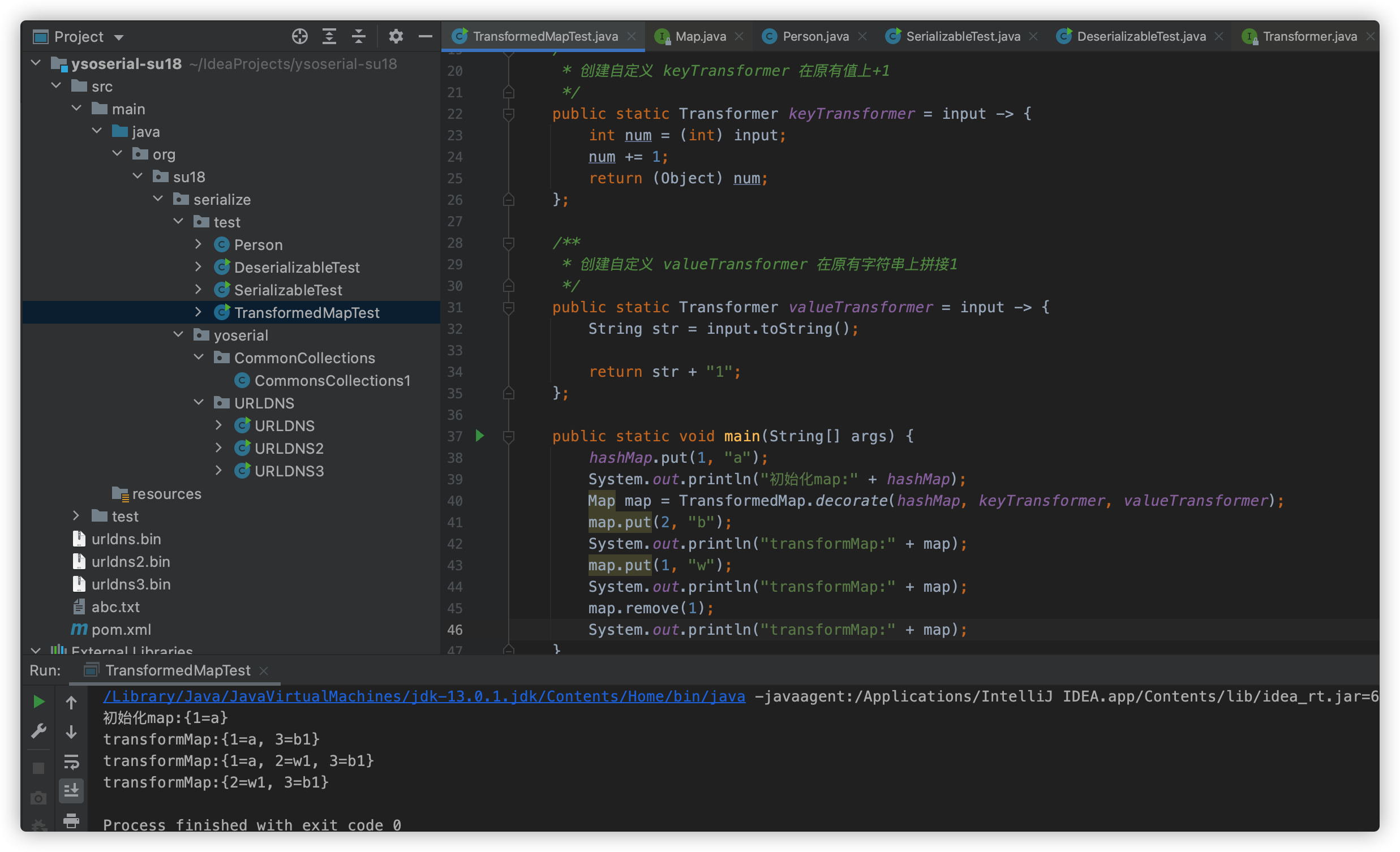 当元素加入集合内时,自动对元素修饰变换(变换逻辑由 Transformer 来定义,Transformer 在 TransformedMap 实例化时作为参数传入)当 TransformedMap 内的 key 或者 value 发生变化时(例如调用 TransformedMap 的 put 方法时),就会触发相应参数的 Transformer 的 transform() 方法。