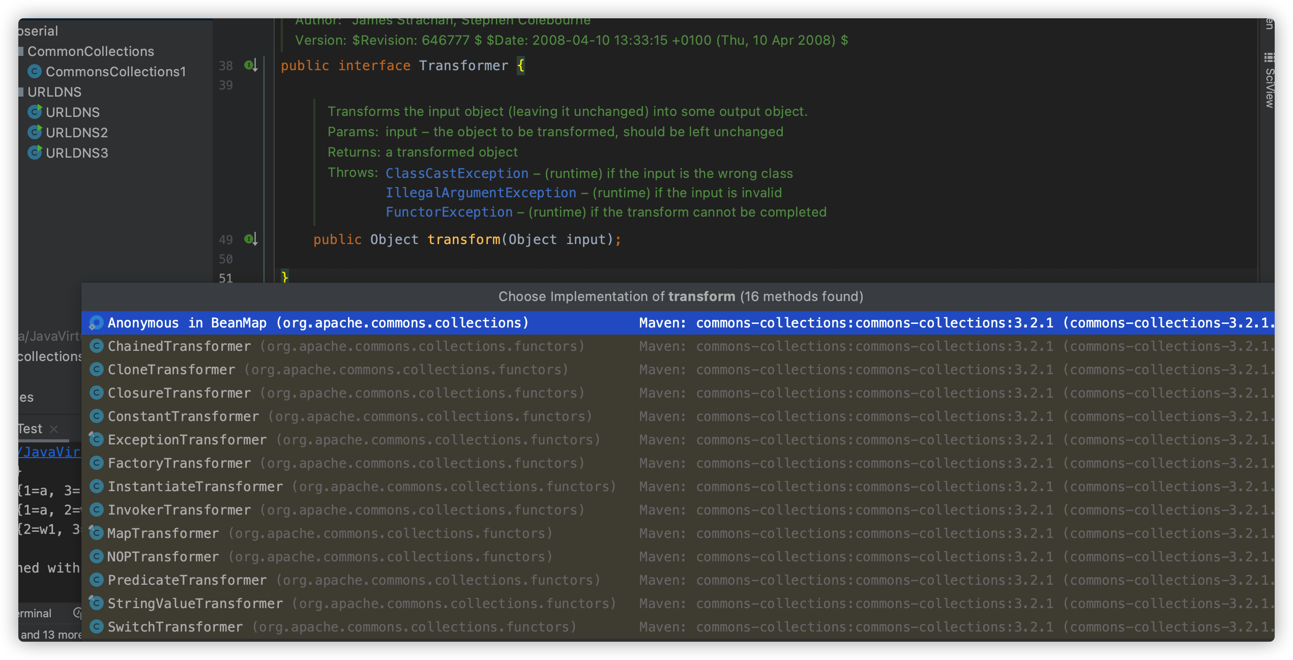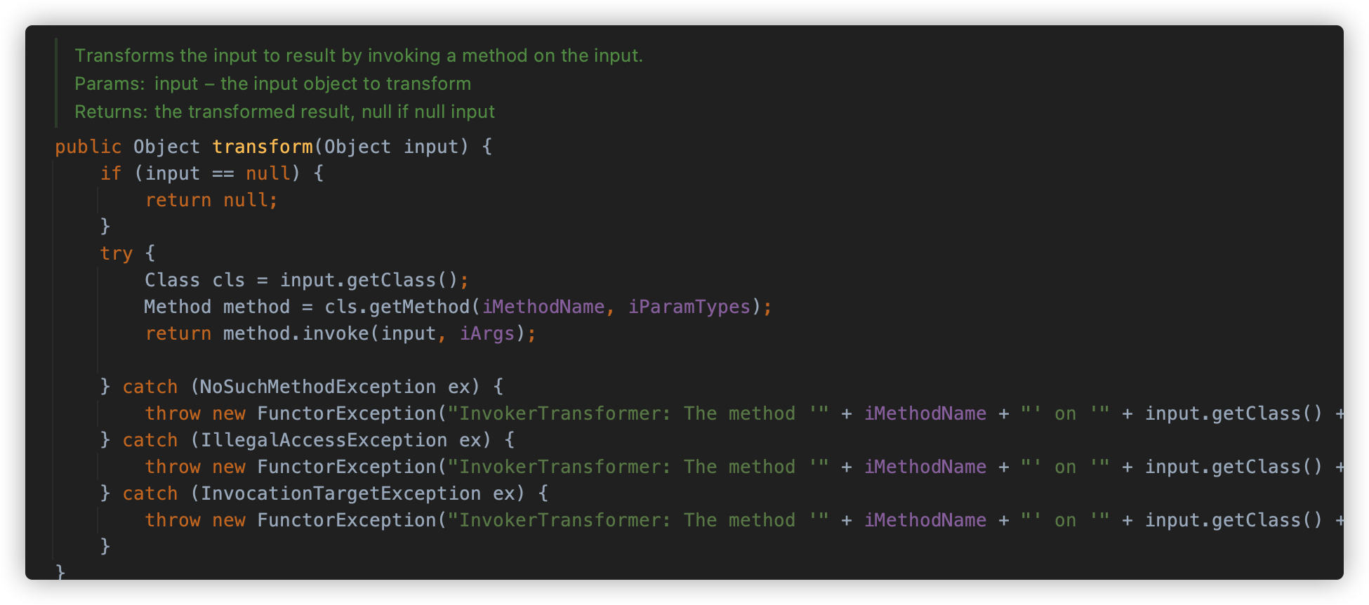 org.apache.commons.collections.Transformer接口,提供了transform() 方法(用来定义具体的转换逻辑),方法接收 Object 类型的 input,处理后将 Object 返回。3.2.1 中提供了 14 个 Transformer 的实现类(用来实现不同的对 TransformedMap 中 key/value 进行修改的功能)重点关注其中几个实现类InvokerTransformer、ChainedTransformer、ConstantTransformer