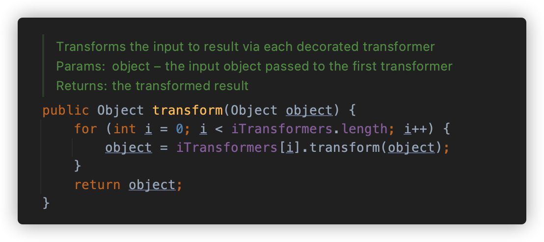 这个类自己维护了一个 Transformer 数组, 在调用 ChainedTransformer 的 transform 方法时,会循环数组,依次调用 Transformer 数组中每个 Transformer 的 transform 方法,并将结果传递给下一个 Transformer。