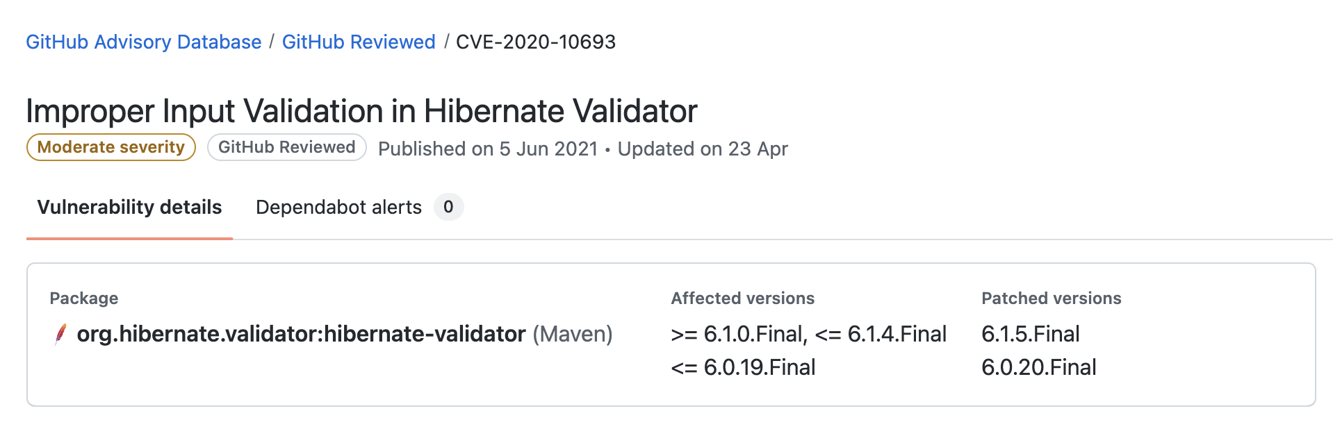 官方给出的漏洞,版本1:https://mvnrepository.com/artifact/org.hibernate.validator/hibernate-validator
