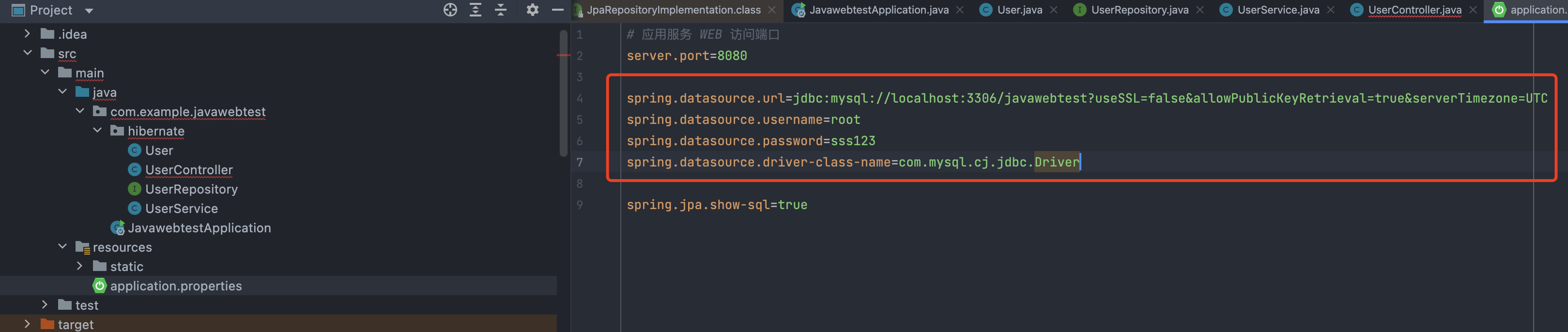 publicinterfaceUserRepositoryextendsJpaRepository<User,Long>{UserfindByUsername(Stringusername);// JPA根据方法名自动生成查询语句 /org/springframework/aop/framework/JdkDynamicAopProxy.class//原生SQL//@Query(value = "select * from user where username = ?1", nativeQuery = true)//User fuzzyQueryByName(String username);//HQL提供的查询语法//@Query("FROM User u WHERE u.username = :username")//User fuzzyQueryByName(@Param("username") String username);//JPQL1提供的查询语法@Query("SELECT u FROM User u WHERE u.username = :username")UserfuzzyQueryByName(@Param("username")Stringusername);//JPQL2提供的查询语法//@Query("SELECT u FROM User u WHERE u.username = ?1")//User fuzzyQueryByName(String username);}