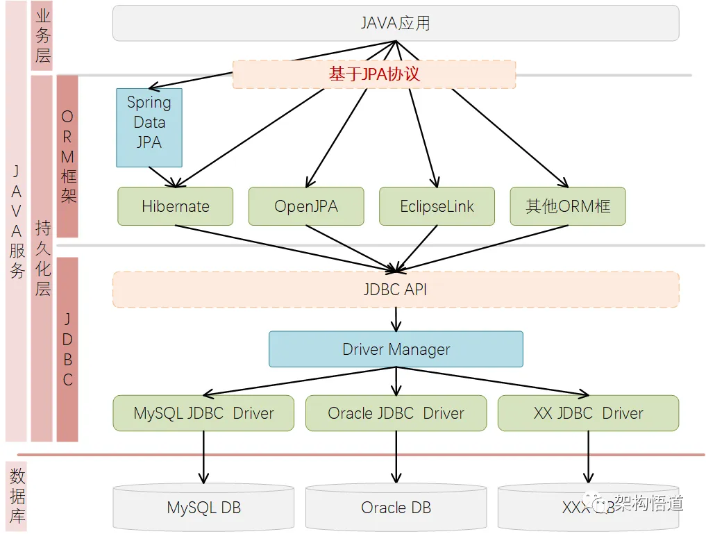 Spring Data JPA不是一个完整JPA规范的实现,它只是一个代码抽象层,主要用于减少为各种持久层存储实现数据访问层所需的代码量。其底层依旧是Hibernate。可以把Spring Data JPA理解为JPA规范的再次封装抽象。JAVA业务层调用SpringData JPA二次封装提供的Repository层接口,进而基于JPA标准API进行处理,基于Hibernate提供的JPA具体实现,接着基于JDBC标准API接口,完成与实际DB之间的请求交互